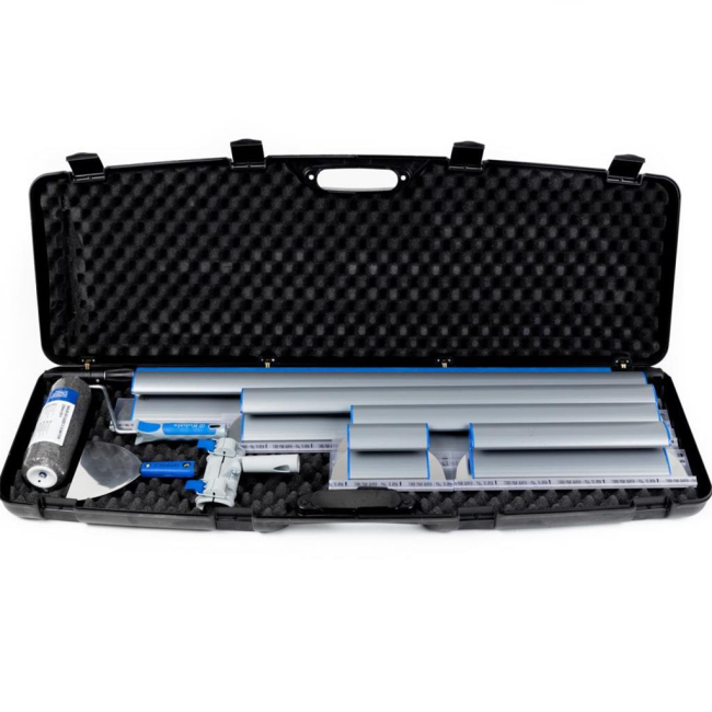 Kovček vsebuje 5 gladilke z izmenjljivim rezilom iz inoxa. Prilagodljivo rezilo gladilke z zaobljenemi robovi ne poškoduje podlage, debelina rezila 0,3mm. Kovček vsebuje držalo gladilke, teleskopsko palico, valj za nanašanje izravnalne mase in pleskarsko lopatico.