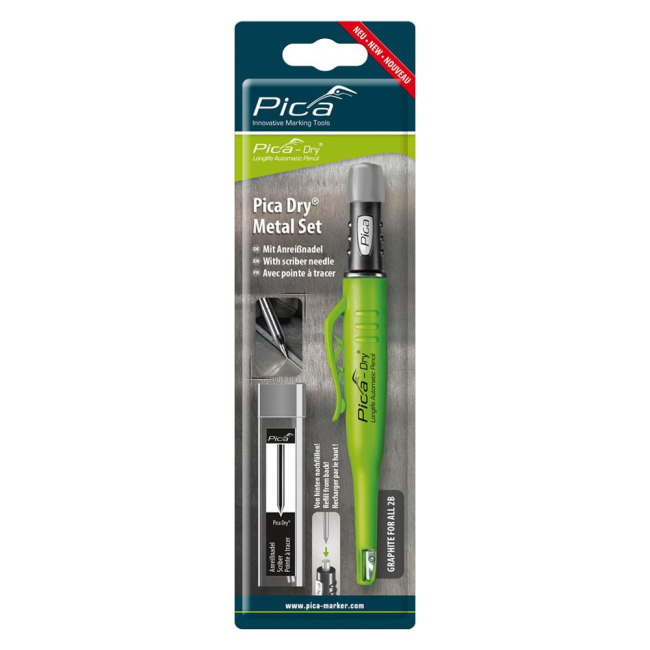 Svinčnik Pica - dry je edini označevalni svinčnik z učinkovito zaščito pred prahom in vlago. Ima visoko kakovosten potisni mehanizem s tesnilom za maksimalno zaščito pred zunanji vplivi. Z novim "POWER LOCK" mehanizmom se je vzdržljivost vodila potrojila. S tem se je tudi občutno podaljšal rok uporabe izdelka. Šilček je vgrajen v držalu z zaponko. Svinčnik ima varovalo proti zdrsu "roll-stop". Pokrovček zadaj je snemljiv in menjava minic se izvaja s hrbtne strani. Ob nakupu je v svinčniku že grafitna minica 2B, ki je namenjena za vse površine. Dodatno je možno kupiti minice različnih barv in za različne namene uporabe. Pakiranje v blistru. V blistru je dodana igla zarisna dolžine 30 mm, izdelana iz volframovega karbida, za natančno označevanje po kovinah.