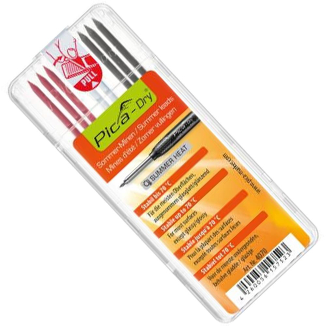 Minice so primerne za skoraj vse površine: mokre ali suhe, grobe, prašne, mastne. Niso primerne za pisanje po steklenih in sijočih površinah. Minice so odporne na toploto do 70°C. V setu 8 minic: 3x grafit 2B, 3x rdeče in 2x bele. Rdeče in bele minice so vodoodporne.