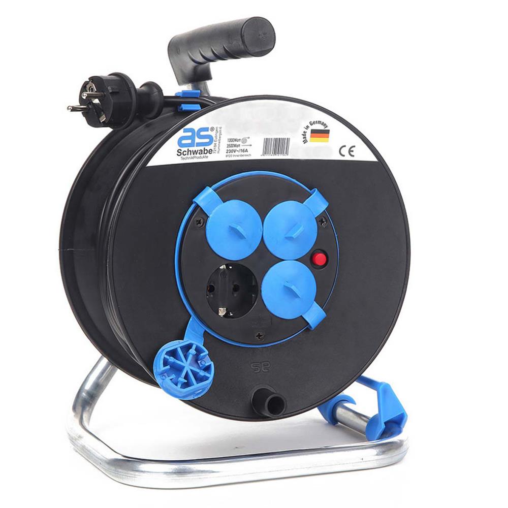 Plastični kolut s stabilnim, pobarvanim podnožjem z zavoro in s patentiranim vodilom kabla. 4 vtičnice z zaščitnimi pokrovčki in VDE zaščitnim termo stikalom. PVC kabel 3x1,5 mm2.