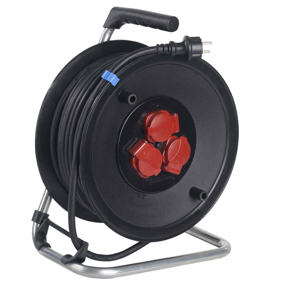 Plastični kolut s stabilnim, pobarvanim podnožjem z zavoro in s patentiranim vodilom kabla. 3 vtičnice z varnostnimi pokrovčki. Gumi kabel 3x2,5 mm2.
