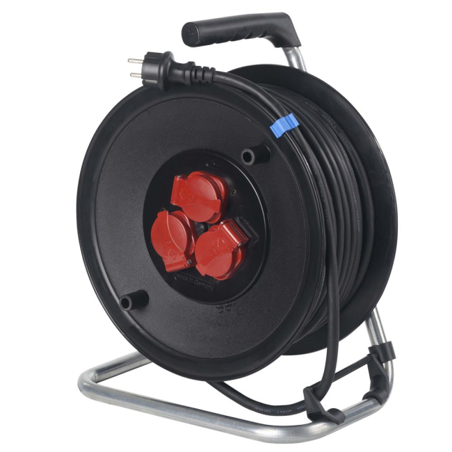 Plastični kolut s stabilnim, pobarvanim podnožjem z zavoro in s patentiranim vodilom kabla. 3 vtičnice z zaščitnimi pokrovčki in VDE zaščitnim termo stikalom. PVC kabel 3x1,5 mm2.