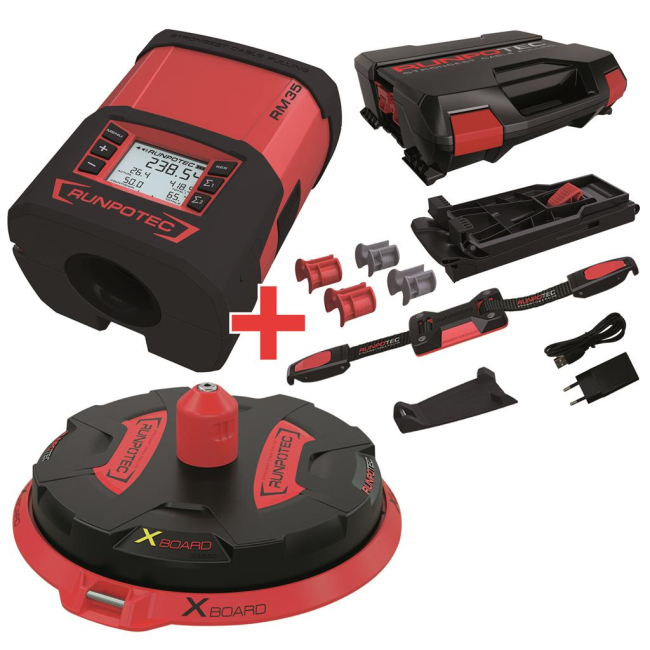 Set vsebuje: digitalno merilno napravo RUNPOMETER RM35 za merjenje dolžine kablov in podstavek XBOARD XB300. V PVC kovčku se poleg merilne naprave in podstavka nahajajo pas s sponko, podlogo za stablizacijo RM35, pritrdilni sistem za na kovček, 4x vodilne čeljusti (2x rdeča, 2x siva), USB-C polnilec ter adapter.