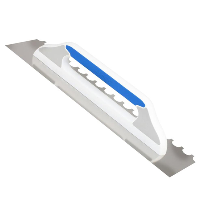 Zidarska gladilka z ergonomsko oblikovanim trikomponentnim ročajem - 3K. Plošča gladilke iz nerjavečega, kislinsko odpornega jekla, debeline 0,7mm, s polkrožnimi zobmi. Za nanašanje samorazlivnih, debelo slojnih in oblikovanih lepil na ploščice velikega formata. Zagotavlja maksimalno prekrivanje ploščic z lepilom.