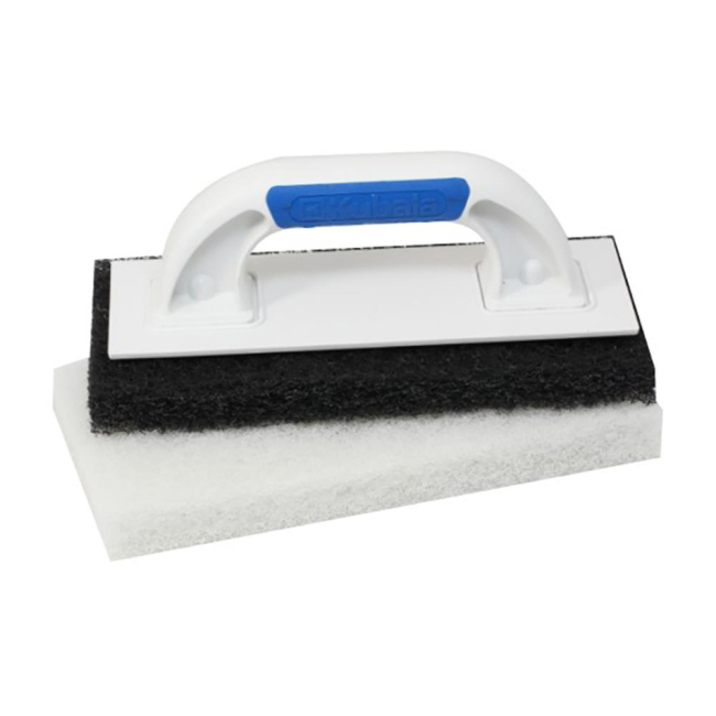 Fugirna gladilka z ergonomsko oblikovanim ročajem - 2K, izdelana iz ABS plastike. Zamenljivo gobo se na gladilko pritrdi z ježki. Nemenjena je čiščenju in poliranju keramičnih ploščic po nanosih epoksi premaza. Set vsebuje: 1x črna goba - trda/groba, 1x bela goba - mehka/fina.