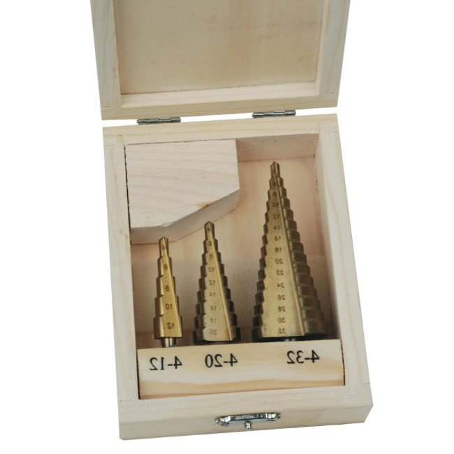 Garnituro sestavljajo stopničasti svedri HSS prevlečeni s plastjo Ti. Dimenzije: 4-12 mm, 4-20 mm in 4-32mm. Uporaba: za vrtanje zlitin in jeklenih plošč do 4 mm debeline, plastike in lesa, široki utori zlahka odvajajo izvrtani material. Premeri so označeni na svedru.