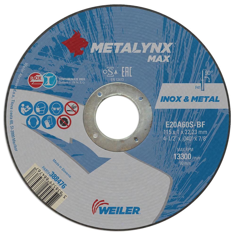 Rezalne plošče Metalynx MAX Inox & Metal zagotavljajo hitro rezanje in dolgo življenjsko dobo plošč pri delu z nerjavnim jeklom in trdimi vrstami jekla. Formula brez onesnaževal zagotavlja brezskrbno uporabo na nerjavnem jeklu. Te plošče so kot nalašč za strokovnjake, ki potrebujejo visokozmogljivo rešitev za najzahtevnejša opravila.