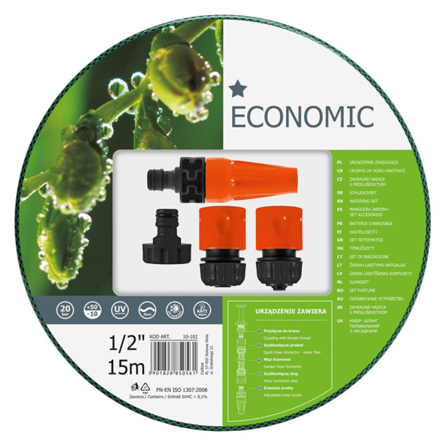 Cev za vodo v kompletu z brizgalno pištolo in nastavki (priključek aqua stop, nastavek za cev in nastavek z not. navojem G3/4"). Cev izdelana iz treh plasti s poliestrsko ojačitvijo. UV obstojna, notranji del cevi odporen na nastanek alg. Uporabna pri temperaturah -10/+50°. Porušitveni tlak 20 barov.